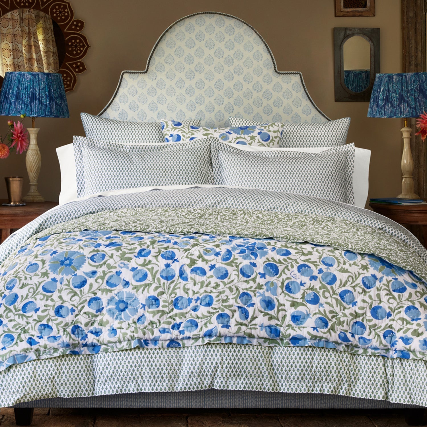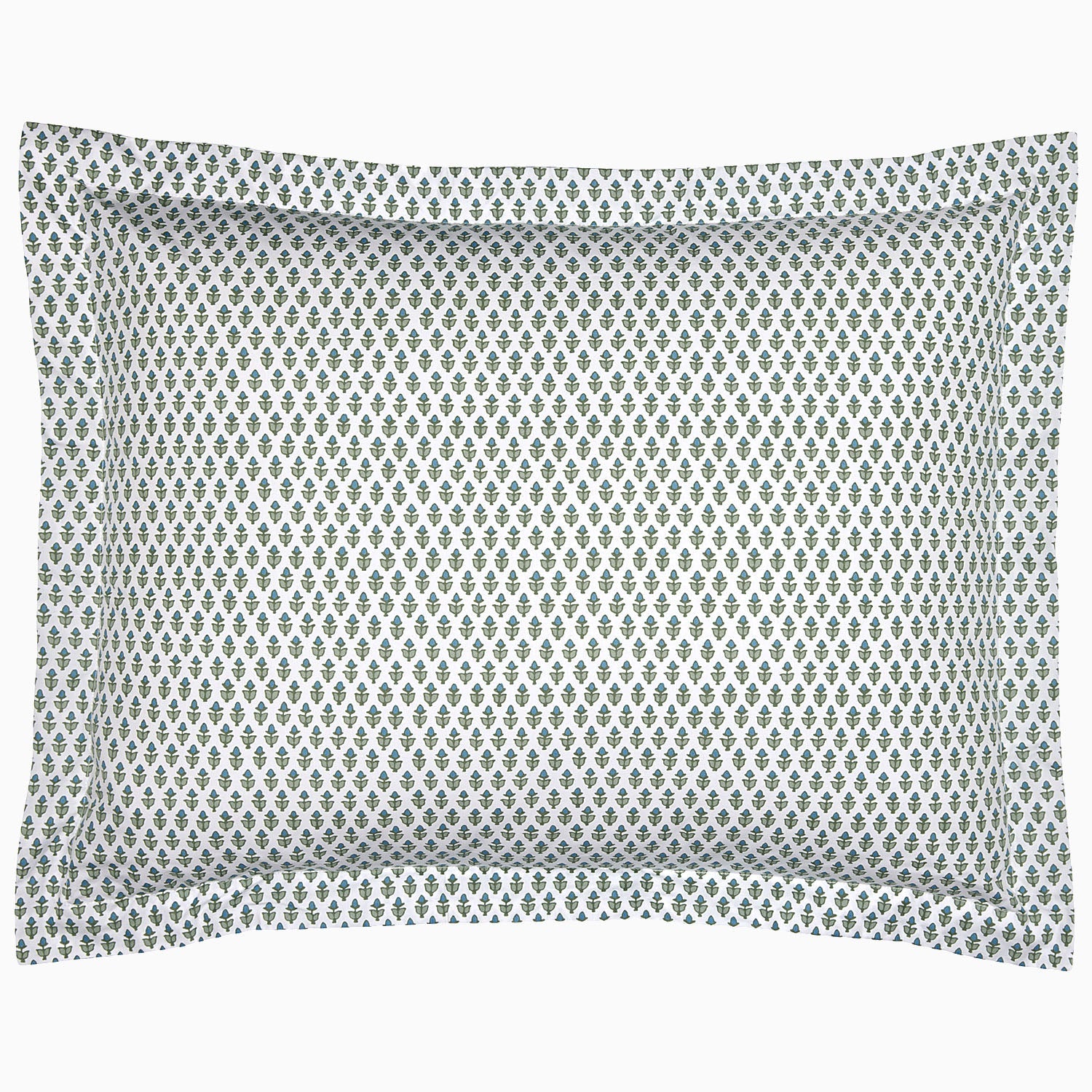 Bring the garden into the bedroom with this blockprint bouquet in a mix of greens and blues. Order a swatch. 100% organic long staple cotton percale 400 thread count Euro has hand stitched edging in light azure and hidden zipper. Sham has 1.5' flange and envelope closure. Made in India Size Guide Machine wash cold, separately, delicate cycle. Tumble dry low. Do not bleach. Iron at medium setting if necessary.