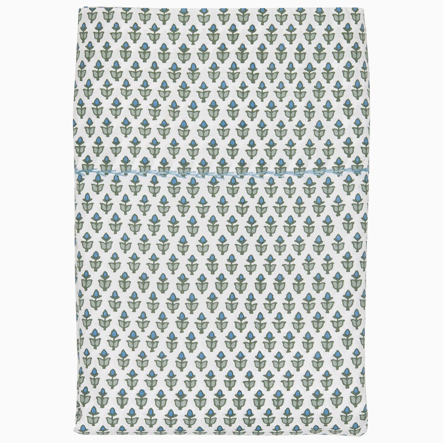 Bring the garden into the bedroom with this blockprint bouquet. Organic long staple cotton percale. 400 thread count. Exceptionally soft and smooth. Order a swatch. 400 thread count 100% organic cotton percale Flat sheet and pillowcases have hand-stitched details Made in India Size Guide Machine wash cold, separately, delicate cycle. Tumble dry low. Do not bleach. Iron at medium setting if necessary.