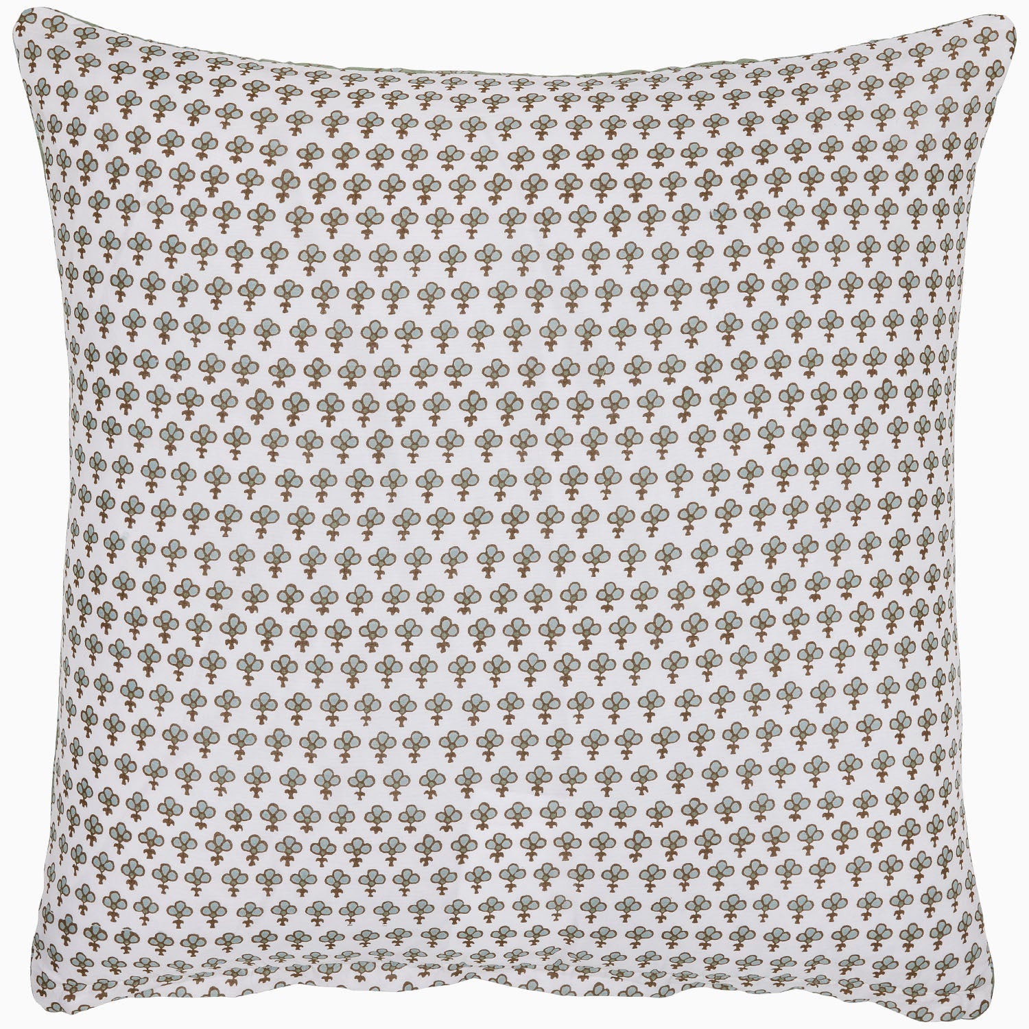 A soft sage green with delicate blue and white flowers inspired by a spring meadow. Quilted by hand, printed on pure cotton voile, soft and lightweight, yet so warm. Order a swatch. 100% cotton voile Hand quilted Coordinating pattern on back Euro has hidden zipper Shams and Euros are sold individually Standard: 20' x 26' King: 20' x 36' Euro: 26' x 26' Made in India Size Guide Machine wash cold separately, delicate cycle, tumble dry low, do not bleach, iron at medium setting if necessary.