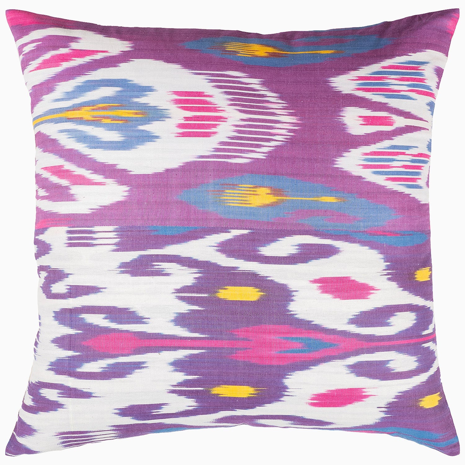 Since his first trip to Uzbekistan, John has been a big fan of these ikats for their intricate designs and large scale, zany colors. They are traditionally woven from silk and cotton on narrow width looms. John had the idea to patch different patterns together and make one larger panel to create a dialog between different prints. Pillow insert sold separately. 22' x 22' Solid natural cotton / linen on reverse Insert sold separately Spot clean only.