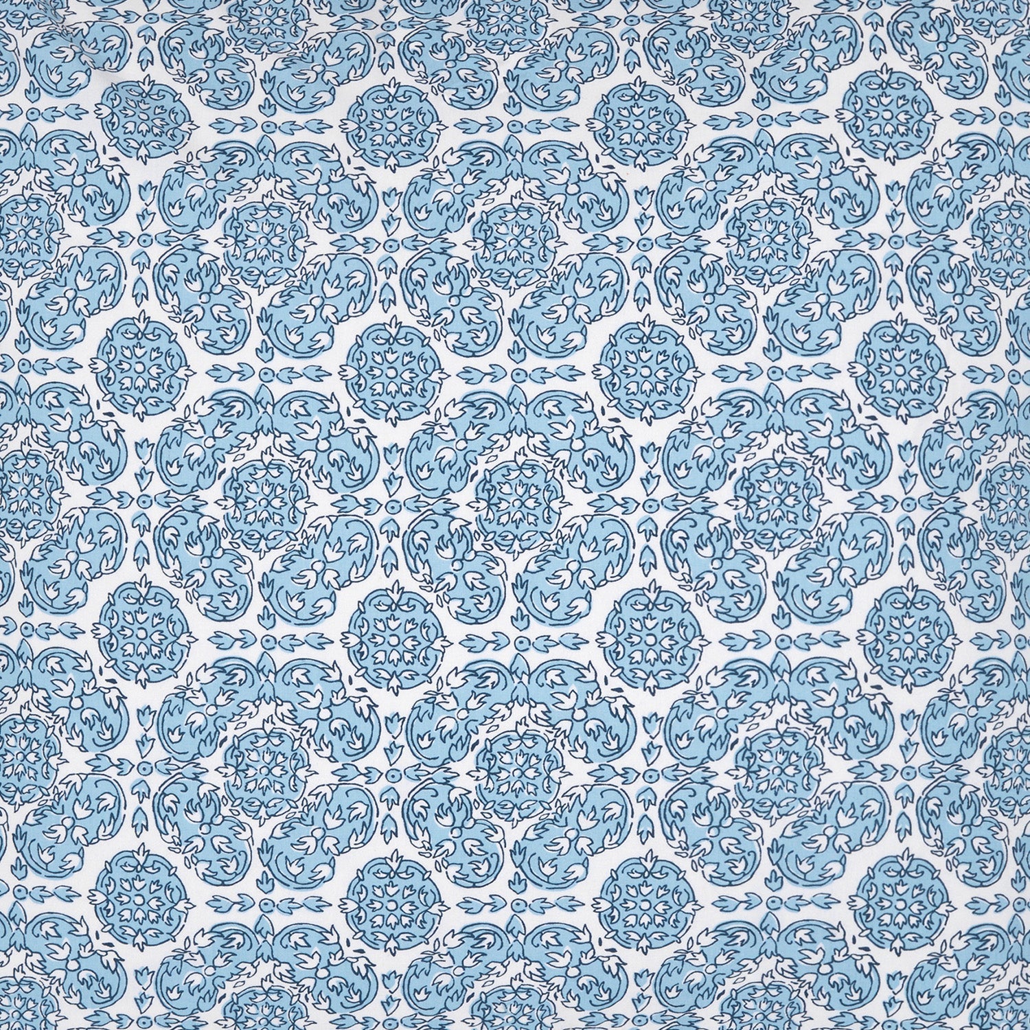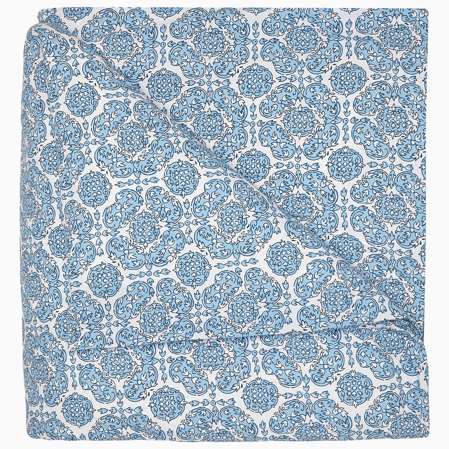 Orderly blue medallions bloom across this duvet in graceful symmetry, inspired by the intricate tile work and flourishing patterns in the Mughal gardens of India. Order a swatch. 100% organic cotton percale 200 thread count Button closure and inner ties to secure duvet insert Made in India Size Guide Machine wash cold, separately, delicate cycle. Tumble dry low. Do not bleach. Iron at medium setting if necessary.