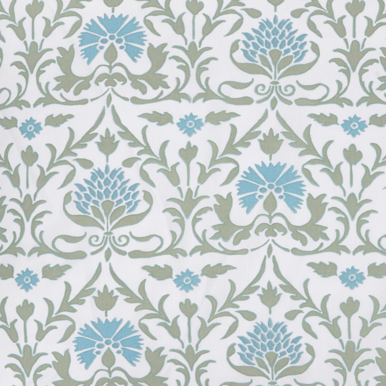 Regal blooms and winding vines in soft blue and sage like a finely maintained garden. Order a swatch. 100% organic cotton percale 200 thread count Button closure and inner ties to secure duvet insert Made in India Size Guide Machine wash cold, separately, delicate cycle. Tumble dry low. Do not bleach. Iron at medium setting if necessary.