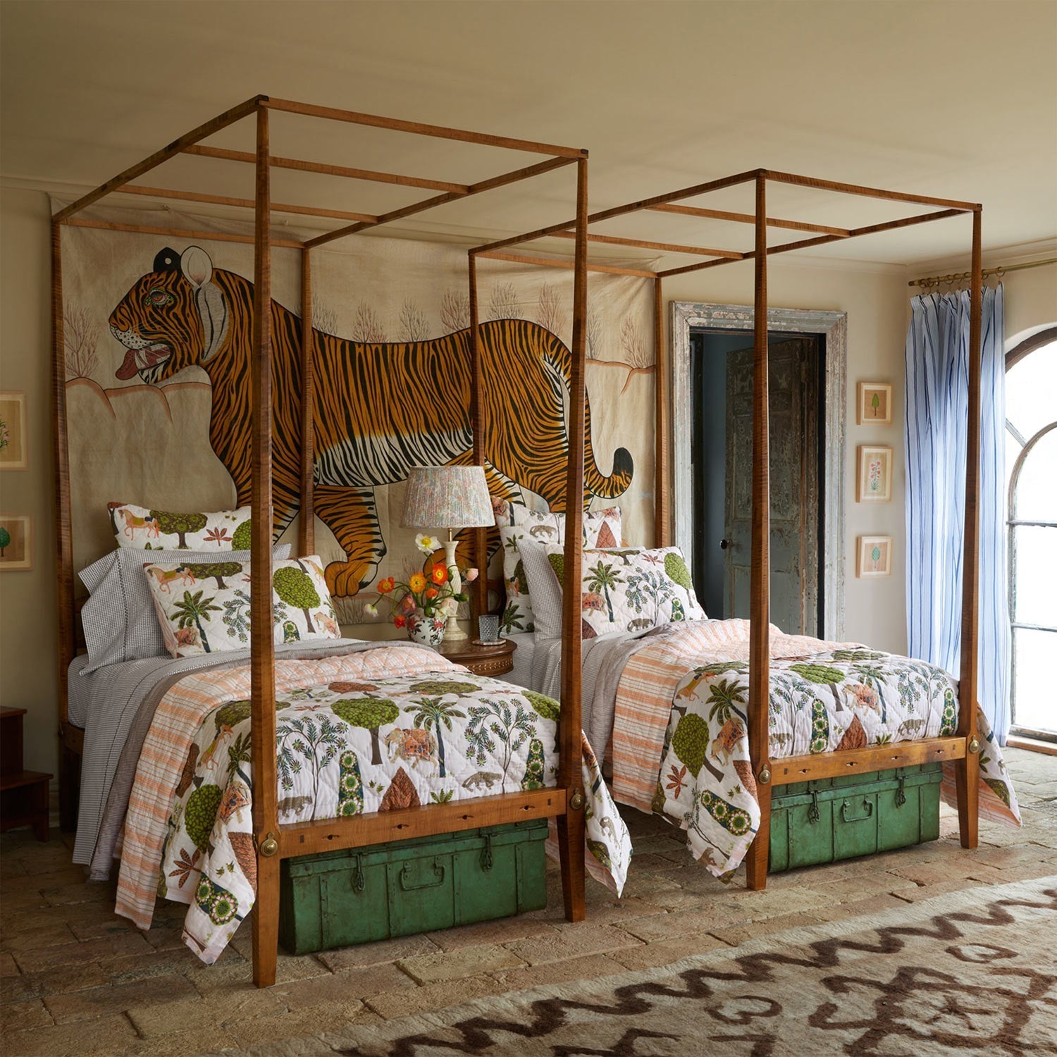 A bold jungle toile brimming with autumn foliage, prowling jaguars, stately horses and elephants on parade. Order a swatch. 100% cotton voile Hand quilted Coordinating stripe on back Made in India Size Guide Machine wash cold separately, delicate cycle, tumble dry low, do not bleach, iron at medium setting if necessary.